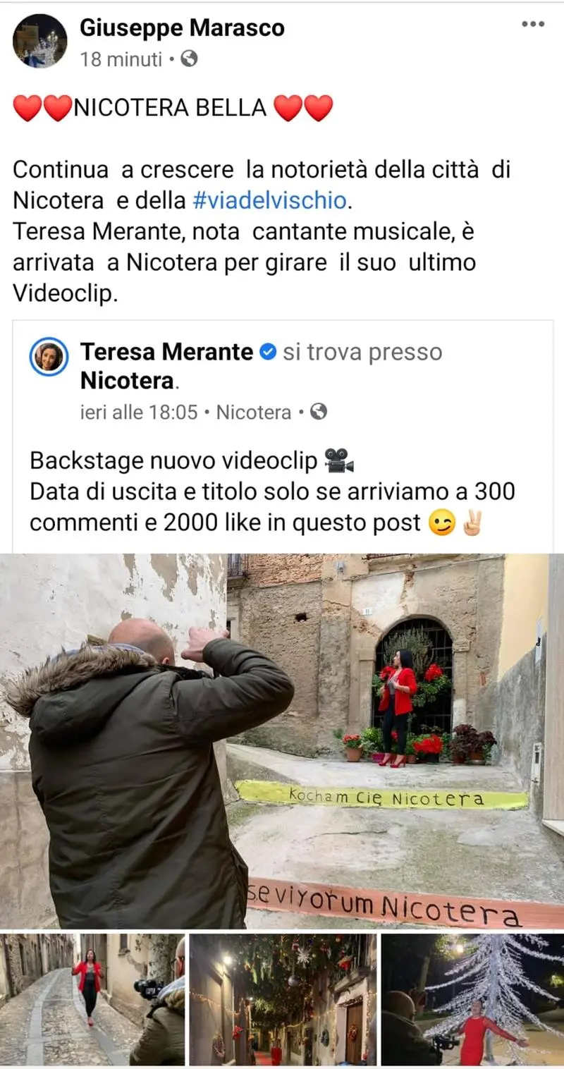 Ci sono poi i post su facebook lasciati sui propri profili dal sindaco Giuseppe Marasco e dal consigliere comunale con delega alla Cultura Giuseppe Leone. Il primo del sindaco Marasco è del 21 dicembre scorso, il secondo del 24 dicembre ed in entrambi si dà conto che la “nota cantante musicale Teresa Merante è arrivata a Nicotera per girare il suo ultimo Videoclip. Continua a crescere la notorietà della città di Nicotera – ha postato il sindaco Marasco – e della via del Vischio”. Entrambi i post, che abbiamo provveduto a salvare e che pubblichiamo (guarda foto in alto), sono stati in questi giorni cancellati dal profilo del sindaco Marasco. [Continua dopo la pubblicità]