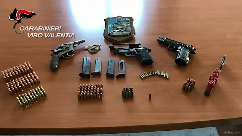 Nello stesso momento altri militari, in servizio di osservazione, hanno notato Morgese allontanarsi da un’altra abitazione di proprietà di Dominello, sita in località “Valli” di Vibo, con in mano un sacco al cui interno venivano rinvenute 1 pistola semiautomatica marca Cz calibro 9 con matricola abrasa; 1 pistola a tamburo senza marca e priva di matricola; 1 pistola a salve con canna presumibilmente modificata e munizioni varie calibro 351 magnum, 12, 22, 9 e 9 Luger.