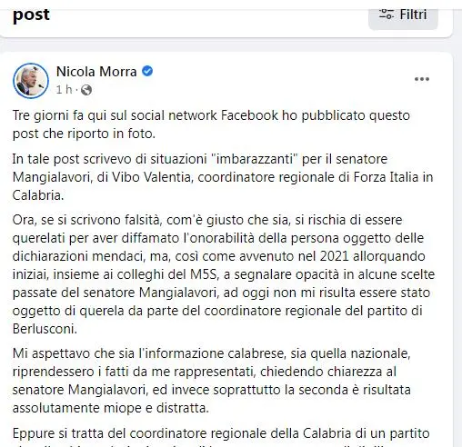 “Tre giorni fa qui sul social network Facebook ho pubblicato questo post che riporto in foto. In tale post scrivevo di situazioni “imbarazzanti” per il senatore Mangialavori, di Vibo Valentia, coordinatore regionale di Forza Italia in Calabria.