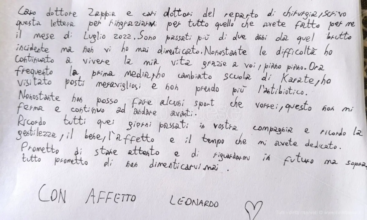 «Caro dottor Zappia e cari dottori del reparto di chirurgia, scrivo questa lettera per ringraziarvi per tutto quello che avete fatto per me dopo quel brutto incidente». Inizia così la lettera che Leonardo, un bambino di Bergamo che oggi ha 11 anni, ha scritto di suo pugno ai medici dello Jazzolino. A quei dottori che due anni e mezzo fa gli salvarono la vita.