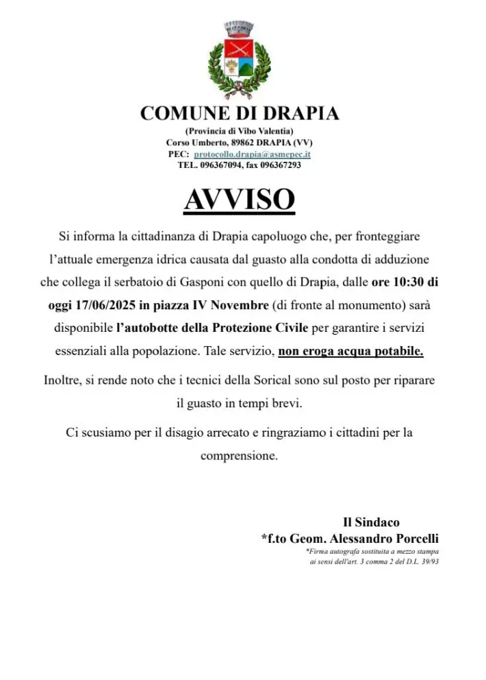 Il guasto alla condotta adduttrice che collega il serbatoio della frazione di Gasponi a quello di Drapia capoluogo, verificatosi tre giorni fa, è grave e mentre gli operai della Sorical sono al lavoro sul posto da ieri per risolvere la rottura del tubo in una zona impervia e inaccessibile con i mezzi meccanici, il Comune si è attivato con la Protezione civile per sopperire alle esigenze della popolazione data la carenza idrica in tutte le abitazioni del paese. «Si informa la cittadinanza di Drapia capoluogo che, per fronteggiare l’attuale emergenza idrica causata dal guasto alla condotta di adduzione che collega il serbatoio di Gasponi con quello di Drapia, dalle ore 10:30 di oggi 17/06/2025 in piazza IV Novembre (di fronte al Monumento) sarà disponibile l’autobotte della Protezione civile per garantire i servizi essenziali alla popolazione. Tale servizio, non eroga acqua potabile. Inoltre, si rende noto che i tecnici della Sorical sono sul posto per riparare il guasto in tempi brevi. Ci scusiamo per il disagio arrecato e ringraziamo i cittadini per la comprensione».