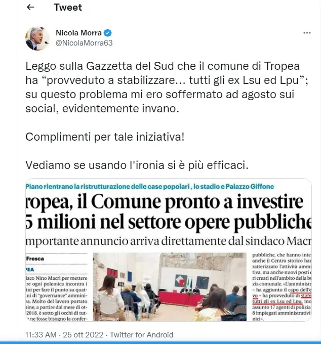 Usa Twitter e l’ironia il presidente della Commissione parlamentare antimafia, Nicola Morra, per commentare le ultime dichiarazioni del sindaco di Tropea, Giovanni Macrì, riportate stamane da un quotidiano regionale. L’ex senatore così commenta un passaggio della notizia: «Leggo sulla Gazzetta del Sud che il Comune di Tropea ha “provveduto a stabilizzare… tutti gli ex Lsu ed Lpu”; su questo problema mi ero soffermato ad agosto sui social, evidentemente invano. Complimenti per tale iniziativa! Vediamo se usando l’ironia si è più efficaci». Il presidente della Commissione parlamentare antimafia riporta quindi la foto dell’articolo con il passaggio di interesse.