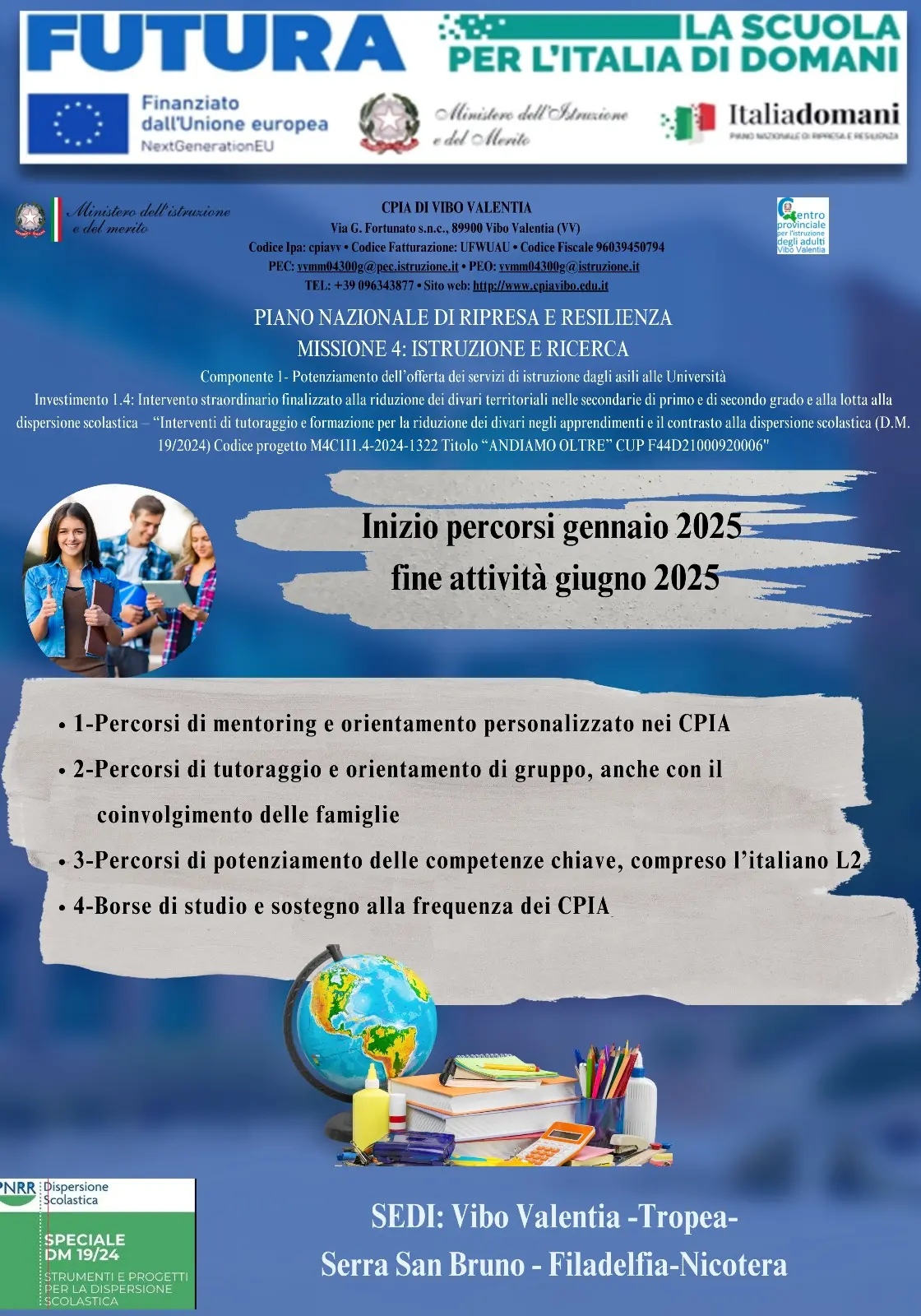 Il dirigente scolastico del Centro provinciale per l’istruzione degli adulti (Cpia) di Vibo Valentia, Giuseppe Policaro, ha annunciato l’avvio del progetto “Andiamo Oltre”, finanziato dal Piano nazionale di ripresa e resilienza finalizzato alla riduzione dei divari negli apprendimenti e al contrasto alla dispersione scolastica. Il progetto è attivo nelle sedi associate di Vibo Valentia, Tropea, Serra San Bruno, Filadelfia e Nicotera. Andiamo Oltre si propone «come un punto di riferimento per la lotta alla dispersione scolastica e per la promozione del successo formativo di tutti gli studenti del territorio», ha fatto sapere in un comunicato stampa il dirigente del Cpia Policaro.