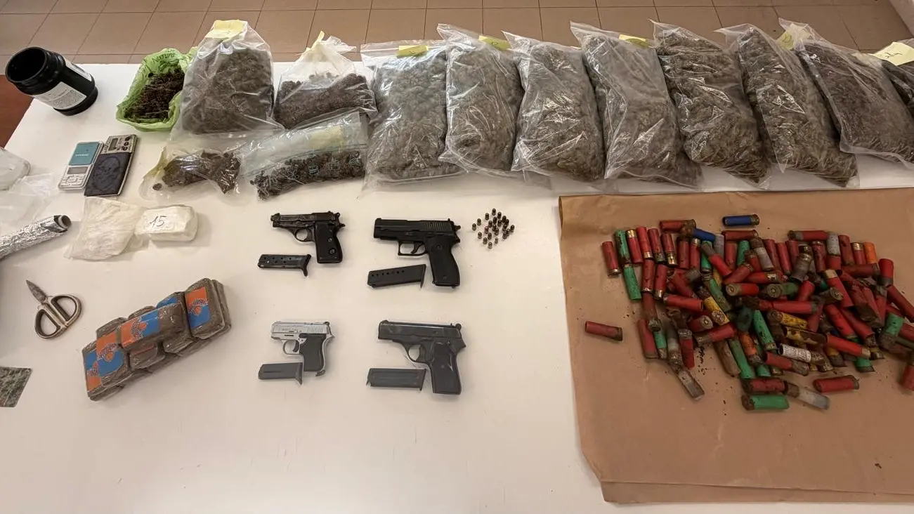 Nel casolare sono stati trovati e sequestrati un chilo di hashish, cinque chili di marijuana, 250 grammi di cocaina, semi di canapa indiana, due bilancini di precisione e materiale per il confezionamento delle dosi. L’approfondimento della perquisizione ha fatto emergere anche la presenza di armi clandestine: quattro pistole, tre delle quali con matricola abrasa, e oltre 480 munizioni di vario calibro.