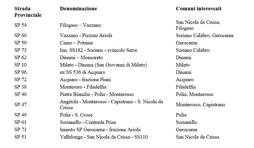 Tra le criticità più rilevanti figura la situazione della strada provinciale 47 “Angitola-Monterosso-Capistrano - San Nicola da Crissa”, interessata da gravi cedimenti che ne hanno reso necessaria la chiusura nel tratto ricadente nel comune di San Nicola da Crissa. Si tratta di un’arteria fondamentale per i collegamenti dell’area interna, la cui interdizione ha determinato forti disagi per cittadini e mezzi di soccorso. «Per questa strada – fanno sapere dalla Provincia – è stata già avanzata una richiesta di finanziamento urgente, finalizzata alla realizzazione degli studi geologici e alla predisposizione di interventi che consentano, almeno nel breve periodo, il ripristino della circolazione in sicurezza, anche a senso unico alternato». Particolarmente critica anche la situazione nel territorio di Polia dove una vasta frana ha concretizzato una situazione di pericolo ambientale con riflessi anche sulle arterie in particolare sulla sicurezza della SP. 45.