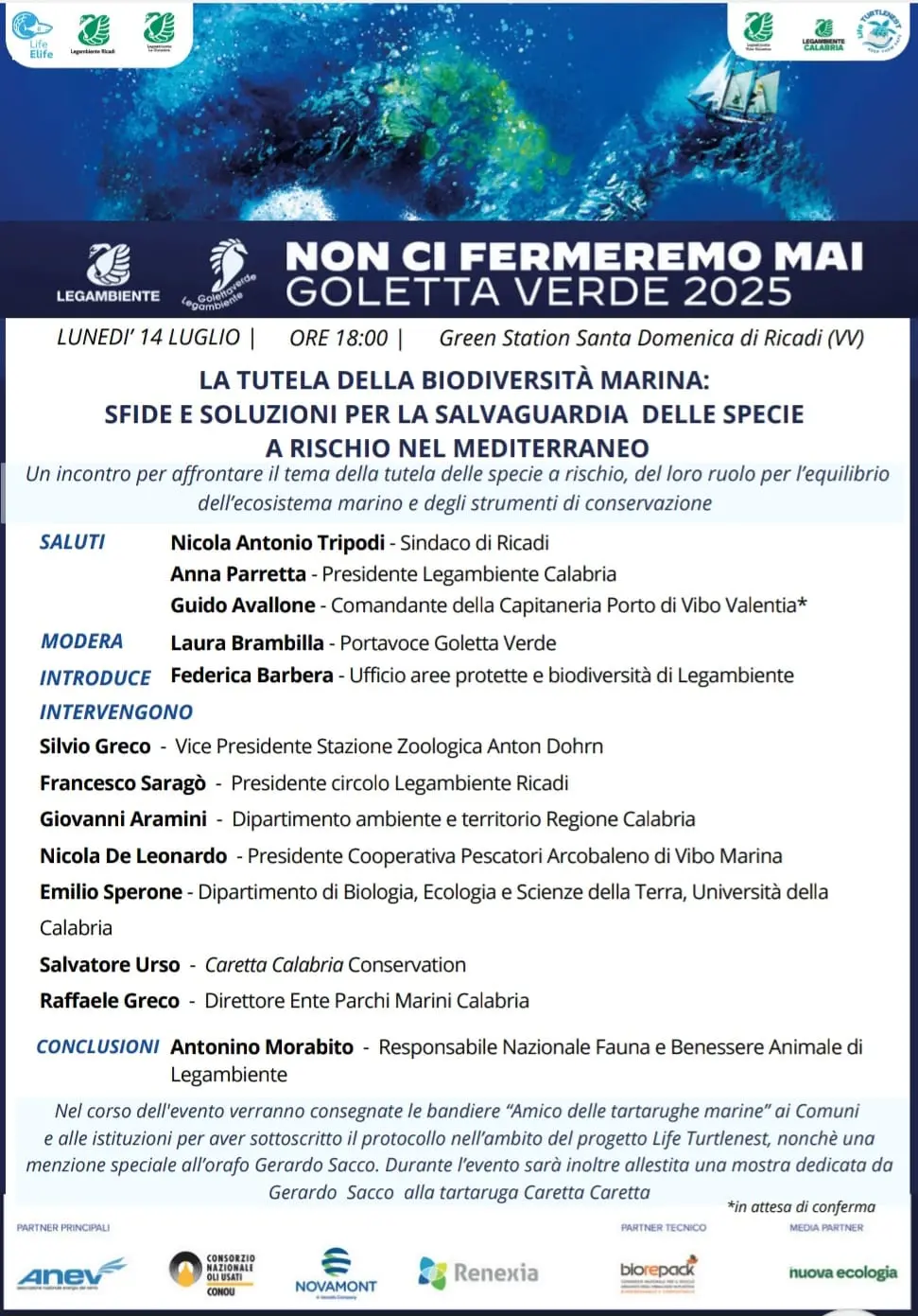 Il primo appuntamento è lunedì 14 luglio alla Green Station di Santa Domenica di Ricadi, alle ore 18, dove si terrà un importante incontro dal titolo “La tutela della biodiversità marina: sfide e soluzioni per la salvaguardia delle specie a rischio nel Mediterraneo”. L’evento, organizzato in occasione della Giornata mondiale degli squali, vedrà la partecipazione di autorevoli figure istituzionali e scientifiche. Dopo i saluti del sindaco di Ricadi, Nicola Antonio Tripodi, Anna Parretta (presidente Legambiente Calabria) e Guido Avallone (comandante della Capitaneria di Porto di Vibo Valentia), l’incontro sarà moderato da Laura Brambilla (portavoce Goletta Verde) e introdotto da Federica Barbera (Ufficio aree protette e biodiversità di Legambiente). Interverranno esperti come Silvio Greco (vicepresidente Stazione zoologica Anton Dohrn), Francesco Saragò (presidente circolo Legambiente Ricadi), Giovanni Aramini (dipartimento Ambiente e territorio Regione Calabria), Nicola De Leonardo (presidente cooperativa pescatori Arcobaleno di Vibo Marina), Emilio Sperone (dipartimento di Biologia, ecologia e scienze della Terra, Università della Calabria), Salvatore Urso (Caretta Calabria Conservation) e Raffaele Greco (direttore Parchi marini Calabria).