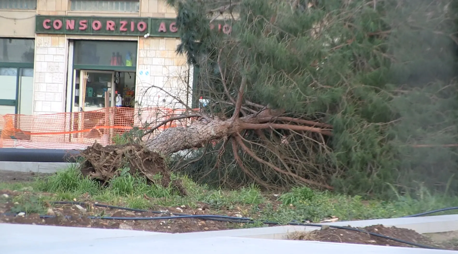 In piazza Salvemini, dove sono in fase di ultimazione i lavori di riqualificazione, uno dei quattro pini superstiti giace a terra, sradicato. Non è chiaro se sia stato abbattuto dalla ditta o se abbia ceduto alle tempeste degli ultimi giorni.