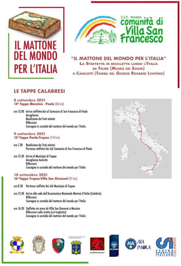 Il Mattone del Mondo destinato all’Italia partito dal Museo dei Sogni a Feltre il 22 agosto 2021 arriverà il 13 settembre 2021 al km 10 della statale Canicattì-Agrigento, dove fu ucciso il giudice Rosario Livatino. Il Mattone sarà poi collocato sulla sua tomba, a Canicattì. Lo porteranno lungo tutta l’Italia ciclisti amatoriali, in collaborazione con il Centro Sportivo Italiano e i comitati di Feltre e Belluno seguendo 19 tappe: