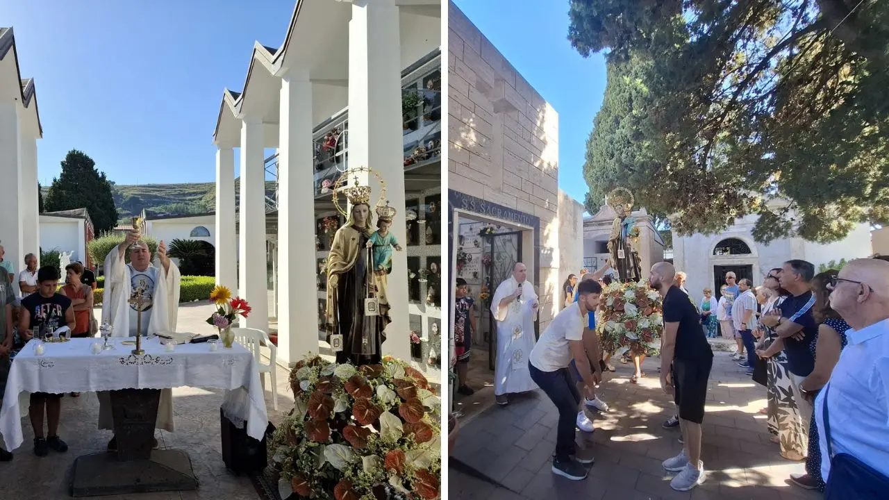 Una giornata storica e profondamente toccante ha segnato la comunità di Caria oggi con la prima, commovente visita della venerata effige della Madonna del Carmelo al cimitero comunale, portata a spalla dai parrocchiani dalla frazione fino all’ingresso di Gasponi. Un evento di grande significato spirituale che ha unito i fedeli in un momento di ricordo e speranza. Con un’emozione palpabile, la statua della Madonna è stata accolta nel luogo sacro dove riposano i defunti. Il parroco di Caria e Drapia, don Felice Palamara, ha presieduto una santa messa all’interno, sentita e partecipata, dedicata al suffragio di tutti i fratelli e le sorelle defunti. La celebrazione odierna si è svolta in questa domenica speciale, che precede la solennità del 16 luglio, giorno in cui si festeggia la Madonna del Carmelo. Al termine della funzione, l’effige sacra ha percorso i viali del cimitero, un cammino silenzioso e solenne. La processione ha toccato le cappelle della confraternita di Caria, dove si è sostato per un momento di preghiera e la benedizione delle tombe, portando conforto e benedizione a coloro che riposano in pace.