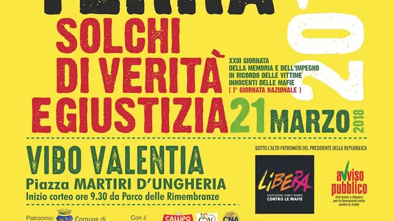 Due giorni prima, venerdì 16 marzo alle 18.30, Libera sarà a Pizzo nei locali del Museo della Tonnara con l’iniziativa “Verso il 21 Marzo tra Memoria e Impegno”, alla quale interverranno il sindaco di Pizzo Gianluca Callipo, il referente provinciale di Libera Vibo Valentia Giuseppe Borrello, il testimone di giustizia Tiberio Bentivoglio e Matteo Luzza referente regionale del settore Memoria di Libera.