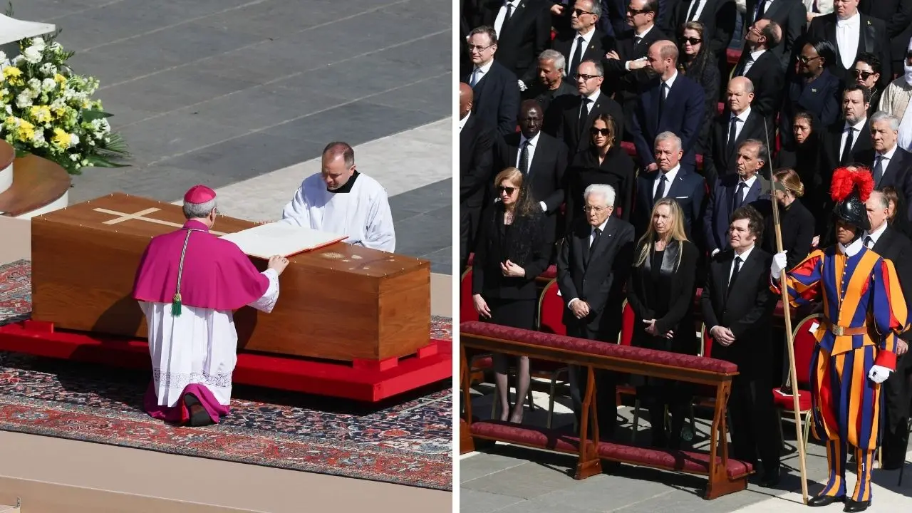 La bara di Papa Francesco è stata aspersa con l’acqua benedetta e incensata dal cardinale che presiede la messa esequiale, Giovanni Battista Re. È uno degli ultimi momenti della celebrazione.