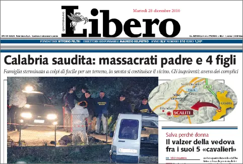 Così corriamo verso il lampeggiante, mentre arrivano altri carabinieri. Delimitano l’area con un nastro bianco e rosso e ci impediscono di avvicinarci oltre. Ma vediamo già abbastanza. Vediamo la masseria teatro della mattanza: vediamo un corpo dopo l’altro, esanime a terra. È una carneficina. Ne avevo visti e raccontati a decine di morti ammazzati nei modi più cruenti, ma quella scena, quella donna con le mani insanguinate, quei cadaveri seminati sulla terra, mi lascia senza fiato. Arrivano altri giornalisti, la Procura e il medico legale. Mettiamo insieme gli elementi essenziali della notizia: uccisi a colpi di pistola Domenico Fontana, 61 anni, ed i figli Pasquale, Pietro, Emilio e Giovanni, di 37, 36, 32 e 19 anni. Squilla il telefono: «“È il Tg4… Le passo il direttore…”. “Sono Emilio Fede, so che sei sul posto, tra un minuto ti mando in diretta, se sai cosa è successo lo racconti, altrimenti dimmi tutto ciò che vedi, portami lì…”». Quando Fede lancia il collegamento telefonico, inizio a raccontare e nel mentre mi rendo conto che di quella strage si parlerà ben oltre i confini della Calabria. Il giorno dopo Repubblica dedicherà due pagine: firmeranno Roberto Saviano e Peppe Baldessaro. Il Corriere della Sera manderà Goffredo Buccini a supporto di Carlo Macrì. Libero titolerà: «Calabria Saudita – Massacrati padre e 4 figli». Rai, Mediaset e Sky inseriranno la strage di Scaliti nei titoli d’apertura.