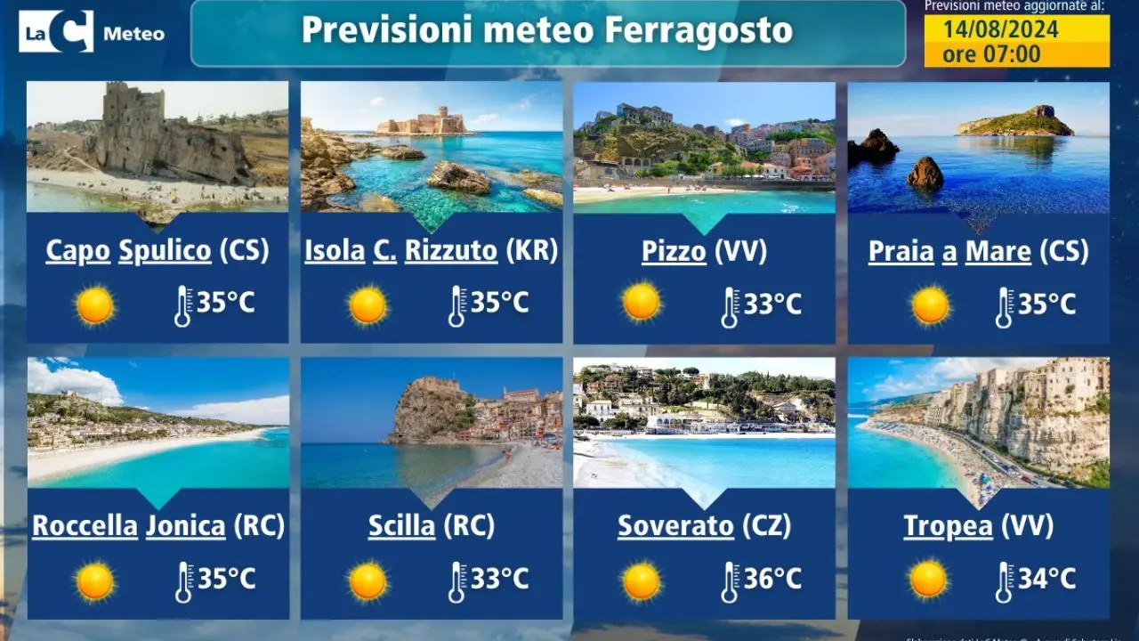 La giornata di Ferragosto vedrà condizioni meteorologiche stabili su tutte le coste vibonesi da Pizzo fino a Nicotera con cieli si manterranno prettamente soleggiati ovunque. Da segnalare solo il passaggio di qualche nuvola innocua nelle ore pomeridiane ma che saranno comunque prive di precipitazioni. Ecco però che un’area di bassa pressione più ad ovest dell’Italia causerà un ulteriore richiamo di aria calda da Sud, la quale apporterà un ulteriore aumento delle temperature. Sono previsti infatti valori di circa 32-33°C lungo tutto il litorale con qualche picco fino ai 34°C specie su Pizzo e nei dintorni di Nicotera. Oltre alle temperature elevate però il disagio più importante sarà causato dall’elevato tasso di umidità che attanaglierà tutte le aree costiere e soprattutto durante le ore notturne, quando il termometro non scenderà al di sotto dei 25°C.
