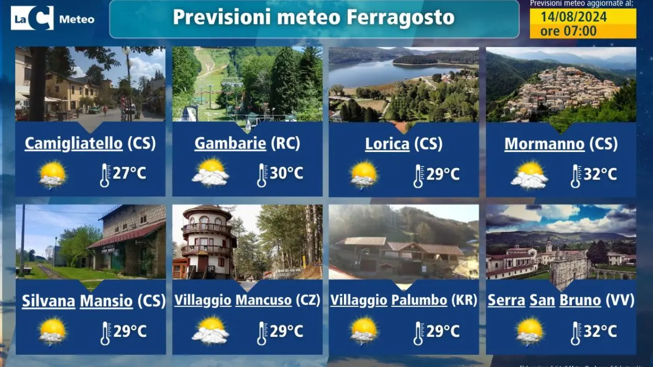 Se nelle aree costiere il caldo sarà molto opprimente, ecco che nelle aree montuose non sarà da meno. Qui infatti il termometro registrerà temperature decisamente elevate con picchi fino ai 36-37°C nelle immediate aree interne tra Soriano Calabro e al confine con la provincia di Reggio Calabria. Da segnalare anche i 32-33°C che si potranno registrare sulle Serre. A differenza dei litorali però, in queste aree il caldo non sarà afoso bensì torrido, con tassi di umidità dunque relativamente bassi. Per quanto riguardano le condizioni meteorologiche avremo una mattinata e una serata caratterizzata da tempo stabile e soleggiato ovunque; durante le prime ore del pomeriggio si registrerà invece un aumento della nuvolosità con possibili e deboli piovaschi molto localizzati sulle Serre ma che si esauriranno in breve tempo.