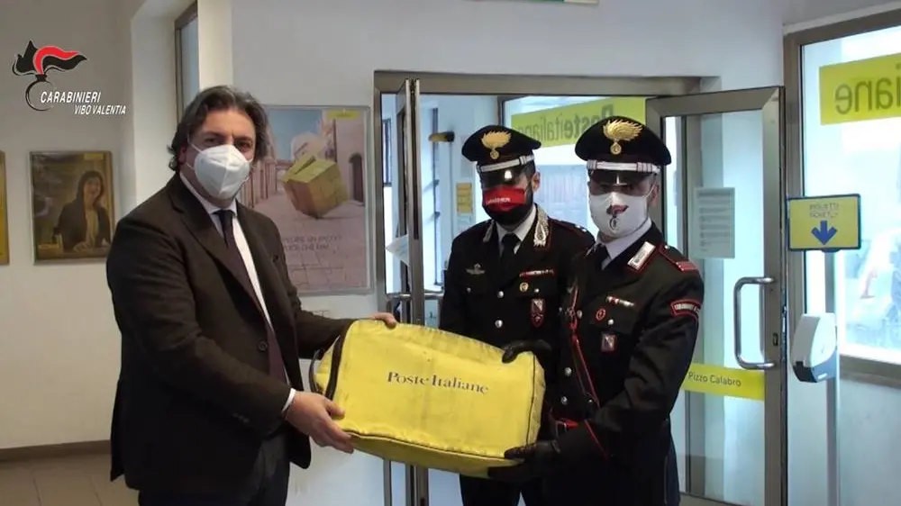 Si è svolta nell’Ufficio postale di Pizzo, bersaglio della rapina consumatasi ieri, la simbolica cerimonia di riconsegna della somma interamente recuperata dai Carabinieri, oltre 60.000 euro in contanti, alla presenza del comandante della locale Stazione carabinieri, maresciallo Marco Failla, e del direttore provinciale di Poste Italiane, Pietro Adige, sottolineata da un fragoroso applauso degli impiegati e dei clienti in quel momento presenti. Nella circostanza, il direttore, visibilmente commosso, ha voluto sottolineare come «la vicinanza dell’Arma sia fondamentale nei piccoli centri come Pizzo», esaltando il ruolo della Stazione Carabinieri, «determinante nella creazione delle sinergie utili per tutta la comunità». «Oggi l’Arma dei Carabinieri restituisce a Poste Italiane il denaro sottrattole nel corso di una rapina che si è verificata ieri – ha detto il comandante della Compagnia di Vibo Valentia, maggiore Gianfranco Pino -. Siamo in periodo di riscossione delle pensioni e auspichiamo che questa restituzione possa essere utile alla filiale, così da poter continuare ad erogare il proprio servizio in favore dei cittadini».
