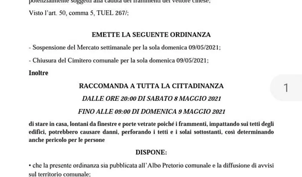 Tanto che la stessa Prefettura vibonese – sulla scorta dell’avviso di Protezione civile – ha diramato un messaggio di allerta con alcune indicazioni rivolte ai Comuni. «La previsione di rientro sulla Terra – si spiega nel documento – è fissata per le ore 2:24 del 9 maggio 2021, con un margine temporale di incertezza di 6 ore. Pertanto, l’allerta è da considerarsi dalle 20:24 di sabato 8 maggio 2021 fino alle 08:24 di domenica 9 maggio 2021. Il Dipartimento consiglia, in quell’arco temporale di stare in casa, lontani da finestre e porte vetrate; i frammenti, impattando sui tetti degli edifici, potrebbero causare danni, perforando i tetti e i solai sottostanti, così determinando anche pericolo per le persone».