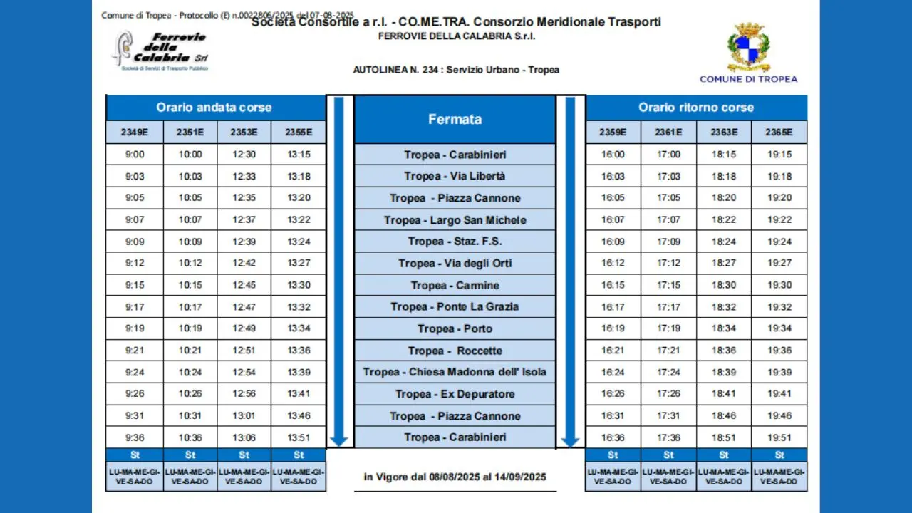 Da ieri a Tropea è attivo un nuovo servizio di navetta che collega, al costo di 1,50 euro a corsa, il centro della città con la zona mare. Il servizio, gestito da Ferrovie della Calabria srl attivato dal Comune, mira a facilitare gli spostamenti dei residenti e dei turisti, riducendo il traffico e migliorando l’accessibilità alle spiagge. La navetta, con la linea Autolinea N. 234: Servizio Urbano – Tropea, copre un percorso circolare con diverse fermate strategiche. Il servizio è attivo sia per la corsa di andata che per quella di ritorno. I percorsi prevedono fermate in punti chiave della città: