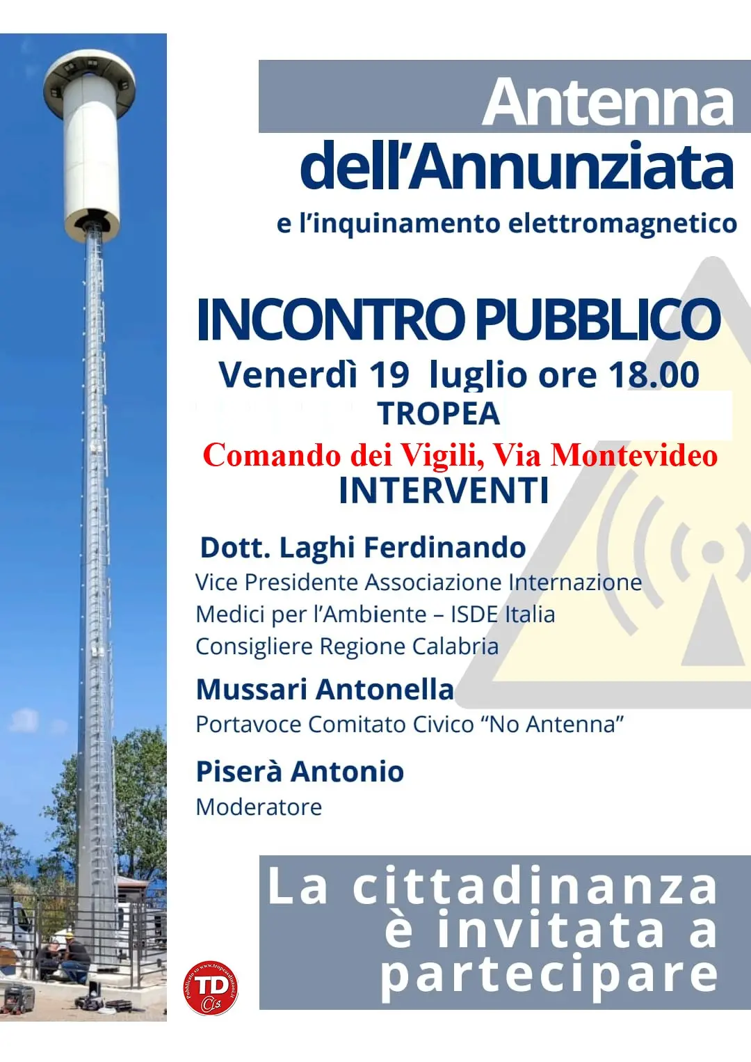 L’appuntamento, dunque, è per le ore 18:00 e vedrà, come da programma stabilito, l’intervento del consigliere regionale Ferdinando Laghi, vice presidente Associazione internazionale medici per l’ambiente – Isde Italia; quello di Antonella Mussari, portavoce Comitato civico “No Antenna”; ed in fine di Antonio Piserà, moderatore. Al centro della protesta, la preoccupazione per i potenziali rischi per la salute derivanti dall’installazione dell’antenna.