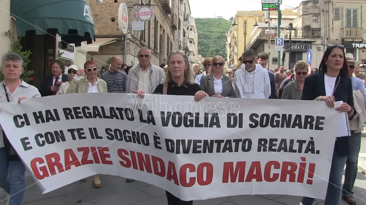 Alla marcia, presidiata dalle forze dell’ordine, c’erano imprenditori turistici, commercianti, ex amministratori e gente comune che ha voluto testimoniare vicinanza al sindaco Nino Macrì: “Ci hai regalato la voglia di sognare e con te il sogno è diventato realtà: grazie sindaco”, la scritta a caratteri cubitali su uno striscione.