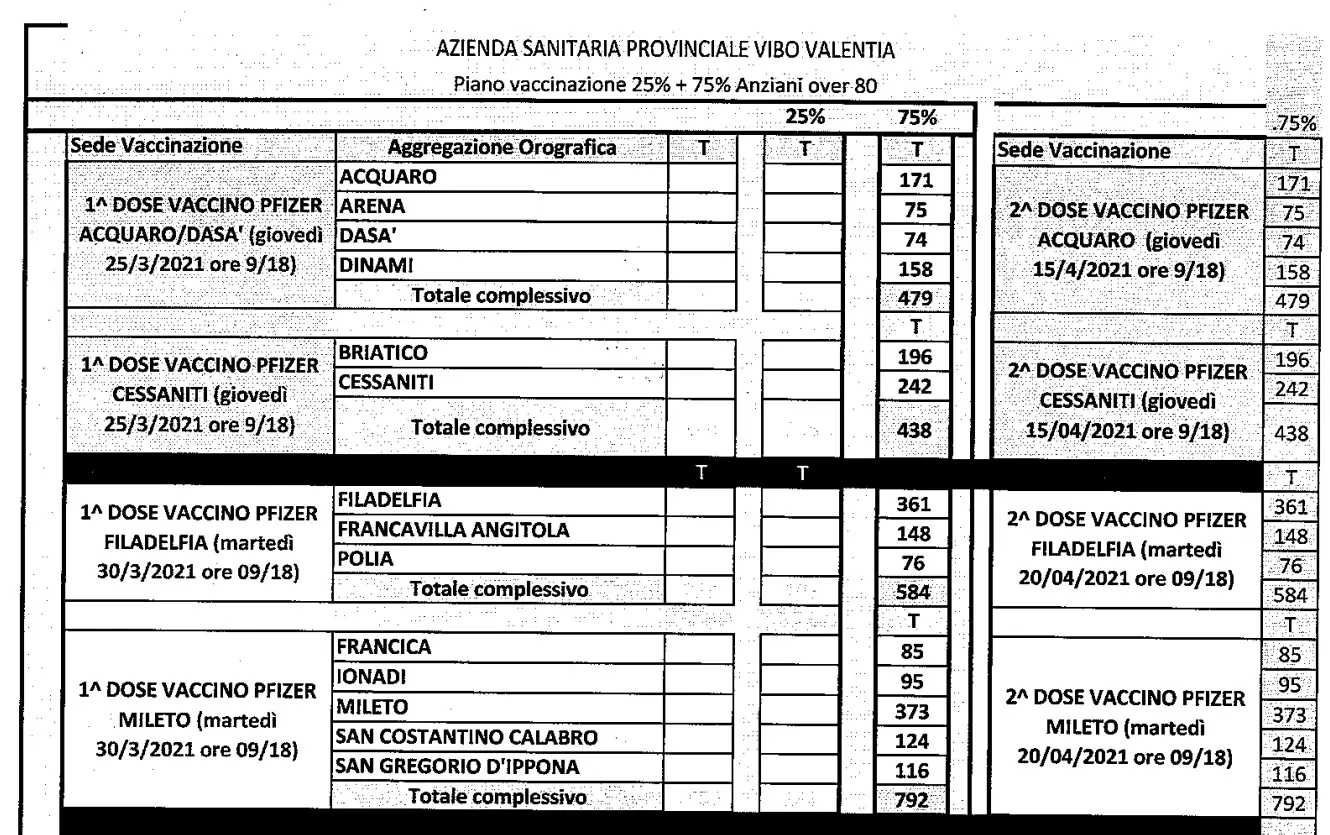 Il calendario, infatti, prevede l’avvio della prima parte della campagna mirata a vaccinare il restante 75 per cento della popolazione over 80 di 14 comuni (il 25 per cento dei quali era già stato vaccinando in precedenza) a partire proprio da domani, giovedì 25 marzo, iniziando da sei comuni, per un totale di 917 persone che dovrebbero convergere, dalle 9 alle 18, nei centri vaccinali di Cessaniti (per Cessaniti, Briatico e rispettive frazioni) e Dasà (per Dasà, Acquaro, Arena, Dinami e rispettive frazioni). Il 30 marzo toccherà alle sedi vaccinali di Filadelfia e Mileto e ad ulteriori 1376 over 80. (Guarda il calendario in basso)