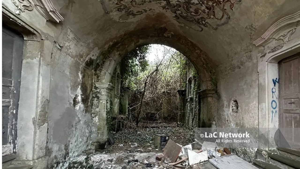 All’interno della corte si presenta uno scenario segnato dall’abbandono: erbacce cresciute senza controllo, ormai parte integrante dell’edificio, e rifiuti disseminati sull’intera area. A questo si aggiungono la presenza diffusa di muffe e muschi sulle pareti e sugli archi antichi del palazzo, mentre sulla volta che sovrasta la corte interna resistono, seppur in modo frammentario, gli ultimi colori di un affresco di pregio.