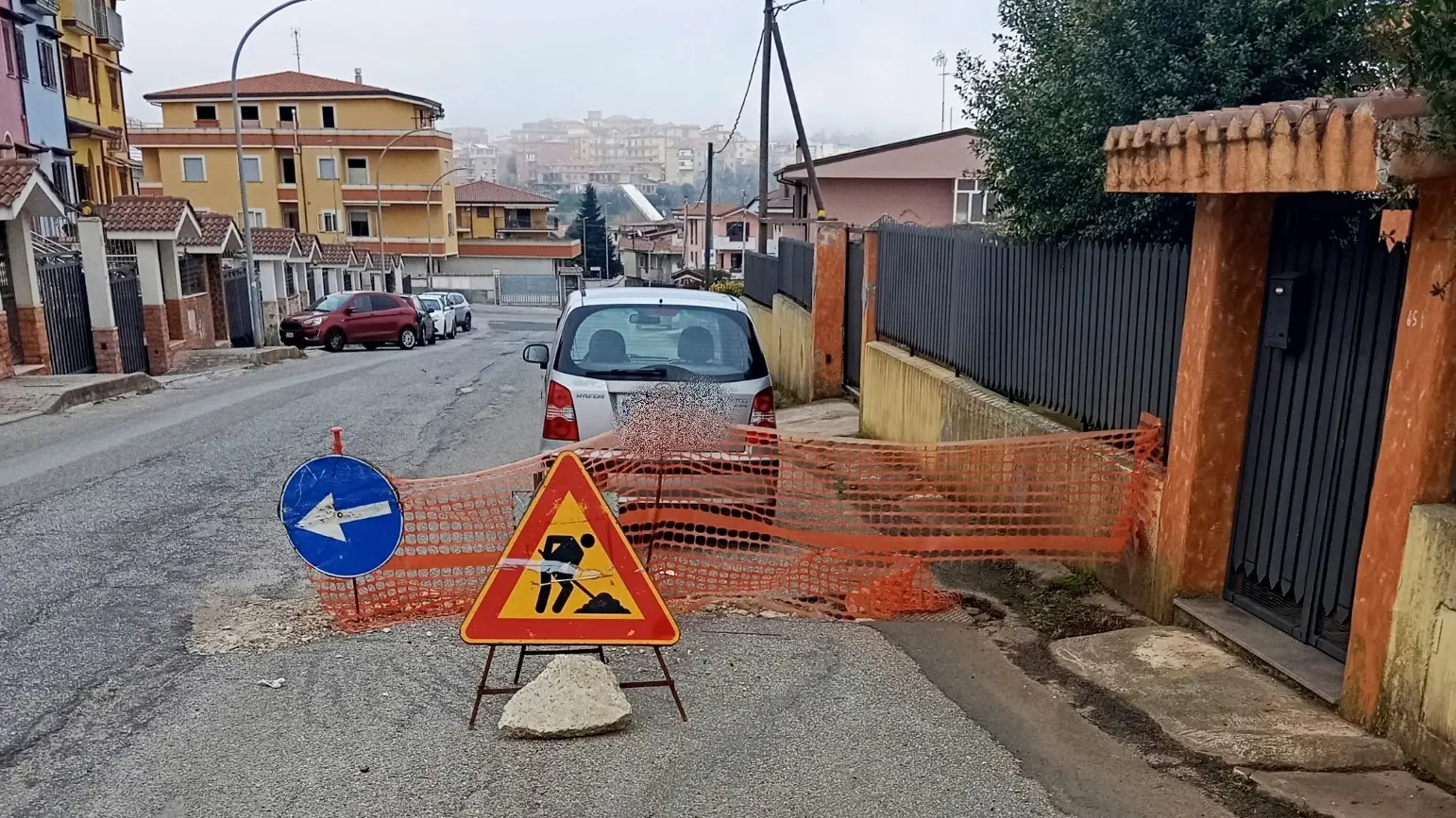 Buca profonda segnalata con una rete arancione da cantiere. Un abitante della zona: «Auto costrette a invadere l’altra corsia per evitarla»