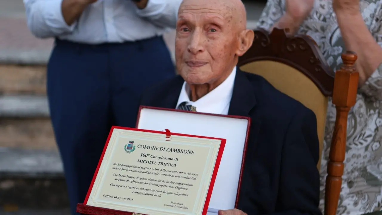 Ieri sera la frazione di Daffinà ha vissuto una serata di festa e commozione per celebrare un traguardo straordinario: il centesimo compleanno di Michele Tripodi. «Un evento – ha fatto sapere il sindaco Corrado L’Andolina in una nota ufficiale – che ha coinvolto non solo la sua famiglia, ma l’intera comunità a testimonianza del profondo rispetto e affetto che circonda un uomo che ha saputo lasciare un segno indelebile nella vita pubblica e privata del paese. Michele Tripodi è molto più di un centenario, è una figura che ha attraversato un secolo di storia e che porta con sé un bagaglio di esperienze uniche. Titolare di una bottega di generi alimentari, Michele ha avuto l’opportunità di conoscere e servire l’intera comunità, creando legami che perdurano nel tempo. Ma il suo impegno non si è fermato qui: ha infatti ricoperto importanti ruoli politici nella Democrazia cristiana, contribuendo attivamente alla vita amministrativa di Daffinà e dei suoi dintorni dal 1960 al 1964».