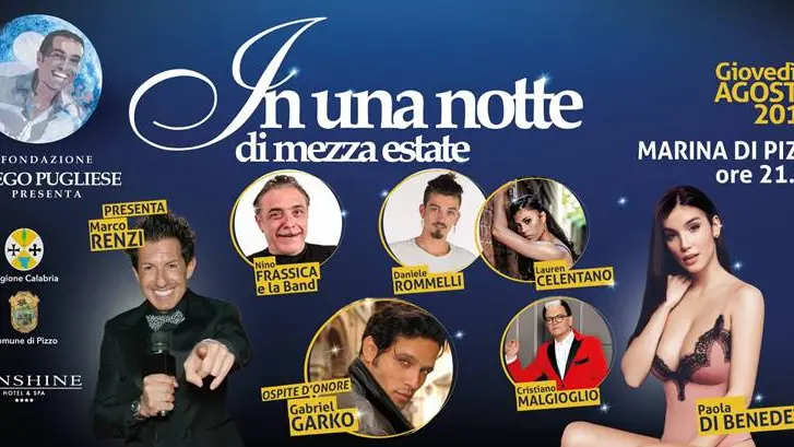 Malgrado il cambio di location, da Tropea a Pizzo, e nonostante alcuni degli ospiti siano cambiati in corso d’opera la quarta edizione di “In una notte di mezza estate” ha colto nel segno. Alla Marina di Pizzo sono state infatti migliaia le persone che non sono volute mancare alla manifestazione promossa e organizzata dalla fondazione “Diego Pugliese Onlus” (in collaborazione con il Comune di Pizzo e il Sunshine Hotel di Ricadi). Lo spettacolo, magistralmente condotto da Marco Renzi e dalla bellissima Paola Di Benedetto è stato impreziosito dal contributo di alcune luminose stelle dello star system italiano. A fare da ingredienti ad una serata magica, infatti, sono stati la simpatia di Nino Frassica, l’estro di Cristiano Malgioglio e, per la gioia dei più giovani, la presenza dell’opinionista e ballerino Gianni Sperti e, direttamente da “Amici”, di Daniele Rommelli e Lauren Celentano. Poi il fuoriprogramma. Al posto dell’attore Gabriel Garko (assente pare per motivi di salute) a dare un tocco di stravaganza all’evento è stato il chiacchierato fotografo Fabrizio Corona.