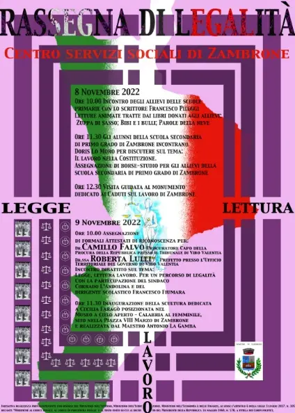 Il 9 novembre toccherà al procuratore Capo della Repubblica presso il Tribunale di Vibo Valentia, Camillo Falvo e al prefetto di Vibo Valentia, Roberta Lulli. A loro verrà conferito un attestato civico di benemerenza per l’impegno profuso nelle loro funzioni pubbliche. Saranno loro a confrontarsi con i ragazzi delle scuole medie sul tema: “Legge, lettura lavoro: per un percorso di legalità”. Al termine, verrà presentata una statua dedicata a Cecilia Faragò, ultima donna processata per stregoneria, realizzata dal maestro Antonio La Gamba che sarà collocata nel Museo a cielo aperto, Calabria al femminile, sito nella Piazza VIII Marzo del capoluogo. Un simbolo antico di sconfitta dell’ignoranza e di trionfo della giustizia. L’iniziativa è stata in gran parte finanziata dal Ministero dell’Interno coi fondi riservati alla tutela dei corpi politici, amministrativi e giudiziari e in misura residuale dall’amministrazione comunale. L’evento avrà luogo presso il Centro servizi sociali di Zambrone.