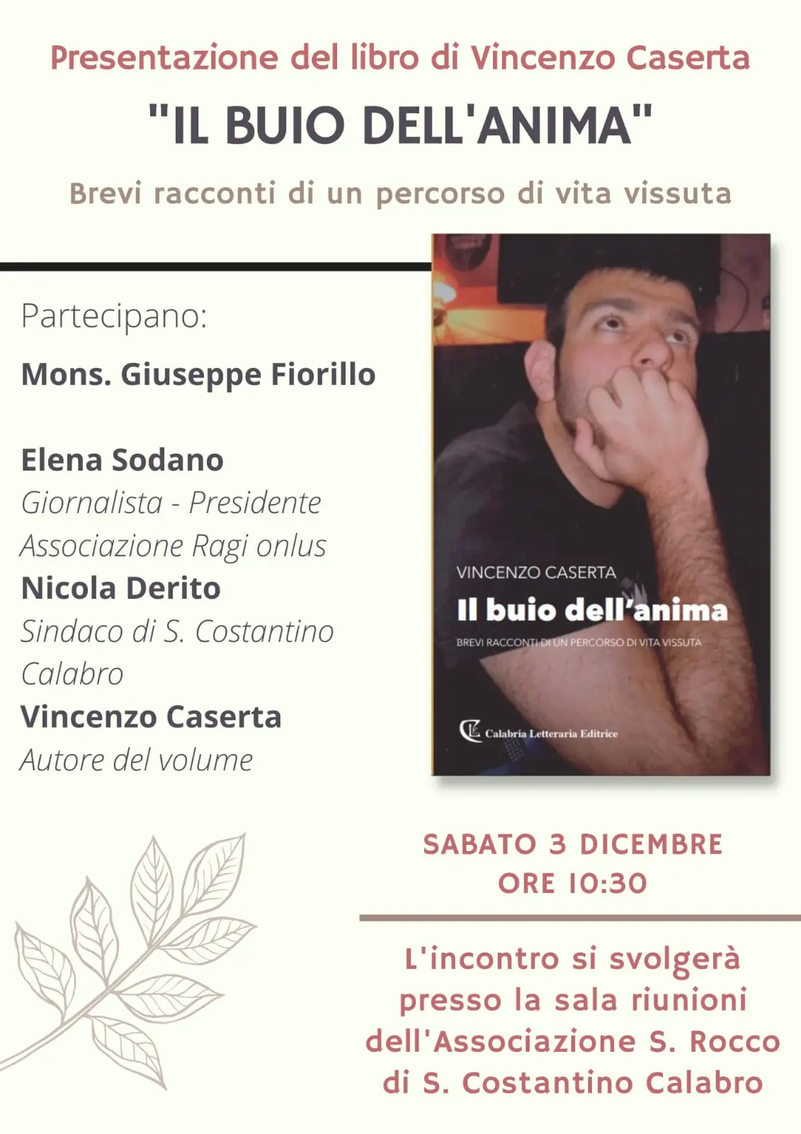 Tutto pronto a San Costantino Calabro per la presentazione del libro “Il buio dell’anima” di Vincenzo Caserta, pubblicato da Calabria Letteraria Editrice. L’appuntamento letterario è in programma domani 3 dicembre alle ore 10.30, all’interno della sede della locale associazione “San Rocco”. All’iniziativa, oltre all’autore, interverranno monsignor Giuseppe Fiorillo e il sindaco di San Costantino Calabro Nicola Derito. Modererà l’incontro la giornalista e presidente dell’associazione Onlus “Ragi”, Elena Sodano. “Il buio dell’anima” è un libro autobiografico scritto con il cuore di un padre che ha perso il figlio giovane; il cuore di chi ha dedicato la propria professione agli altri operando nel sociale e per la comunità. L’autore, nello specifico, ripercorre i tratti significativi e prevalenti della propria vita, dalla giovinezza fino agli anni in cui è stato dirigente del Dipartimento Servizi sociali della Regione Calabria. Nel volume si intrecciano le vicende di Caserta con i luoghi dell’infanzia vissuta a San Costantino Calabro (suo paese natio), descrivendone i tratti gioiosi, con tanto di supporti fotografici, e soffermandosi sulla sua famiglia, in particolare sul padre sindaco di questa comunità per circa venti anni. [Continua in basso]