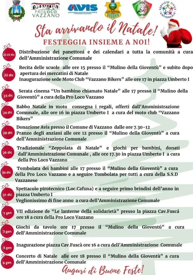- Il 28 dicembre, donazione Avis presso il Comune di Vazzano dalle ore 7.30-12.00, pranzo anziani presso il Mulino della gioventù a cura dell’amministrazione comunale.