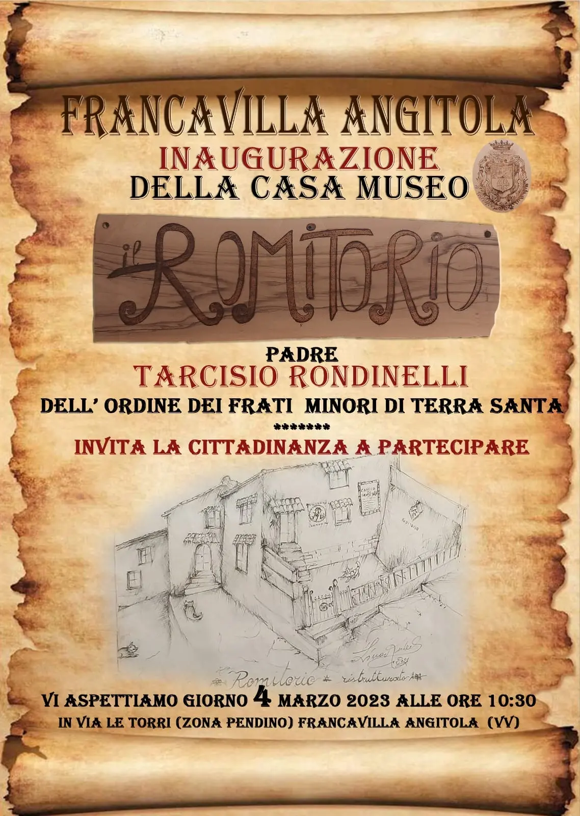 A Francavilla Angitola nasce la casa museo “Il romitorio”. Il progetto, fortemente voluta da padre Tarcisio Rondinelli dell’Ordine dei frati minori di Terra santa, si concretizzerà l’inaugurazione in programma il 4 marzo, alle ore 10.30 in via Le torri. In esposizione, pirografie da lui realizzate e disegni raffiguranti Terra santa, scene religiose, San Francesco di Assisi. Il romitorio inoltre vanta una ricchissima biblioteca. Un lavoro portato avanti per mesi che ha permesso al religioso di confezionare apprezzate opere. Padre Rondinelli, 89 anni, ha un legame assai profondo con la comunità d’origine.
