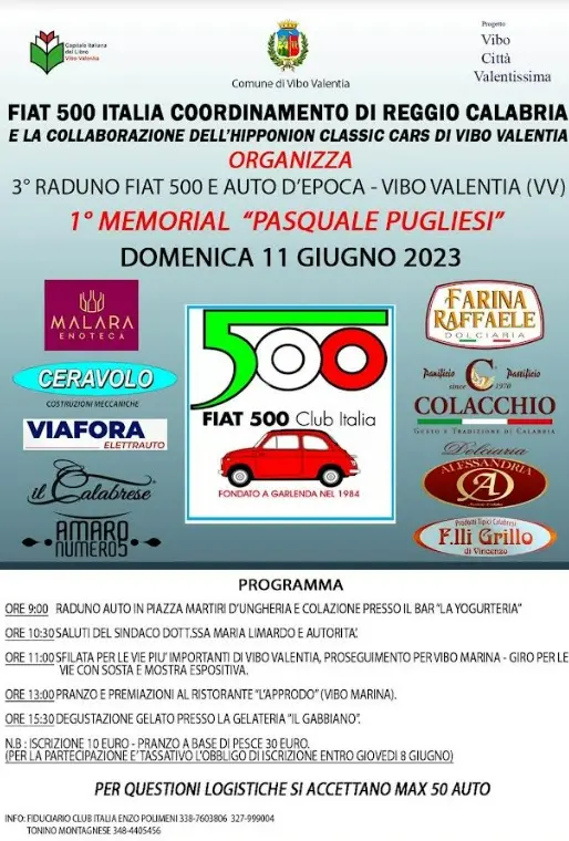 Il “Fiat 500 Club Italia coordinamento Reggio Calabria”, in collaborazione con l’amministrazione comunale di Vibo Valentia e l’Hipponion Classic Cars di Vibo Valentia, organizza per il terzo anno consecutivo il raduno delle Fiat 500, quest’anno anche “Primo memorial Pasquale Pugliesi”. L’appuntamento è per domenica 11 giugno, con il raduno fissato per le ore 9.00 in piazza Martiri d’Ungheria. Alle 10.30 i saluti del sindaco Maria Limardo, alle 11.00 l’inizio della sfilata per le vie della città e poi la prosecuzione verso Vibo Marina, dove alle 13.00 è previsto il pranzo e poi la premiazione. Nel pomeriggio esposizione delle auto e pausa per un gelato. “Invito tutta la cittadinanza – dichiara il primo cittadino – a partecipare, ed a chi ha un’auto d’epoca, anche diversa dalla 500, a sfilare. Ringrazio inoltre sia gli organizzatori che la Polizia municipale che come sempre si occuperà di garantire la sicurezza della manifestazione”.