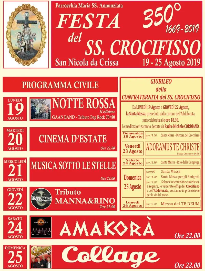 La Confraternita del SS. Crocifisso di San Nicola da Crissa ha organizzato una settimana di importanti festeggiamenti sia religiosi che civili. La Confraternita festeggia infatti i 350 anni di storia, traguardo importante che la pone tra le confraternite più antiche della Calabria. Ed è proprio per i suoi 350 anni che il Papa ha concesso alla stessa l’Anno Giubilare in cui tutti i fedeli in alcune giornate, tra cui il settenari del Crocifisso dal 19 al 26 agosto, potranno lucrare le indulgenze plenarie. Un altro momento di grande religiosità sarà vissuto venerdì 23 agosto con la solenne celebrazione liturgica dell’Adoramus Te Christe in piazza Crissa, che quest’anno arriva alla 40^ edizione. La processione dell’imponente statua lignea del SS. Crocifisso degli Angeli portata a spalle per tutte le vie del paese chiuderà la festa religiosa domenica 25 agosto.