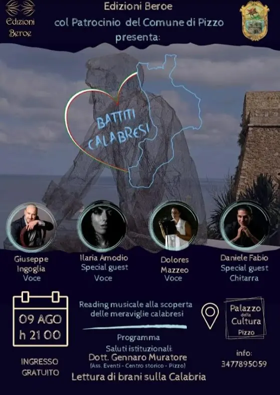Pizzo ospiterà la prima data della seconda edizione di “Battiti Calabresi”, il reading musicale itinerante ideato da Edizioni Beroe. Il Comune napitino accoglierà la kermesse culturale ideata dal direttore artistico ed editore Renato Costa, il 9 agosto dalle ore 21 presso il terrazzo del Palazzo della Cultura. Il reading è un viaggio esperienziale fra le meraviglie paesaggistiche calabresi attraverso la lettura di autori famosi di vario genere fra i quali: Dalida, Rino Gaetano, Carlo Diano, Francesca Diano, Alexandre Dumas, Edward Lear, Cesare Pavese, Corrado Alvaro, Leonida Repaci. Le letture godranno delle voci degli attori Dolores Mazzeo e Giuseppe Ingoglia e della partecipazione straordinaria della poetessa napitina Ilaria Amodio. L’accompagnamento musicale sarà eseguito dal celebre maestro e compositore chitarrista Daniele Fabio.