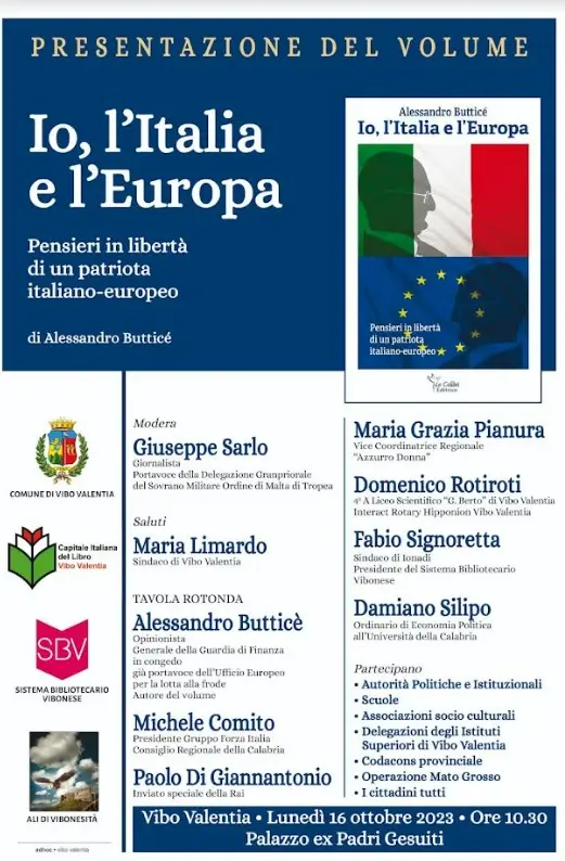 Come vediamo l’Europa? Come l’Europa vede noi italiani, il nostro Paese? Punti di vista di primaria importanza, ma tra il nero e il bianco ci sono tante sfumature che bisogna cogliere per comprendere bene da dove si viene e dove si va. Su questi presupposti si basa un incontro, in programma a Vibo Valentia lunedì 16 ottobre, alle ore 10.30, nel Palazzo ex Padri Gesuiti. Qui è infatti atteso Alessandro Butticè, generale della Guardia di finanza oggi in congedo, già portavoce dell’Ufficio europeo per la lotta alla frode, con un trascorso da giornalista ed ora opinionista. L’occasione la fornisce l’evento organizzato dall’assessorato alla Cultura del Comune di Vibo Valentia guidato dall’assessore Giusi Fanelli, con la partecipazione del Sistema bibliotecario vibonese e dell’associazione Ali di vibonesità, nel corso del quale verrà presentato il volume di Butticè, “Io, l’Italia e l’Europa – Pensieri in libertà di un patriota italiano-europeo”. All’incontro, al quale è invitata tutta la cittadinanza – moderato dal portavoce della Delegazione Granprioriale del Sovrano militare ordine di Malta di Tropea, Giuseppe Sarlo – dopo i saluti del sindaco Maria Limardo, al via la tavola rotonda, che verrà animata dagli interventi, oltre che dell’autore, anche del capogruppo di Forza Italia in Consiglio regionale, Michele Comito; dell’inviato speciale Rai, Paolo di Giannantonio; della vice coordinatrice regionale di Azzurro Donna, Maria Grazia Pianura; dello studente e membro Interact Rotary Domenico Rotiroti; del presidente del Sistema bibliotecario vibonese Fabio Signoretta; dell’ordinario di Economia politica all’Unical, Damiano Silipo. È inoltre prevista la partecipazione di autorità politiche e istituzionali, scuole, associazioni culturali, Codacons, Operazione Mato Grosso.