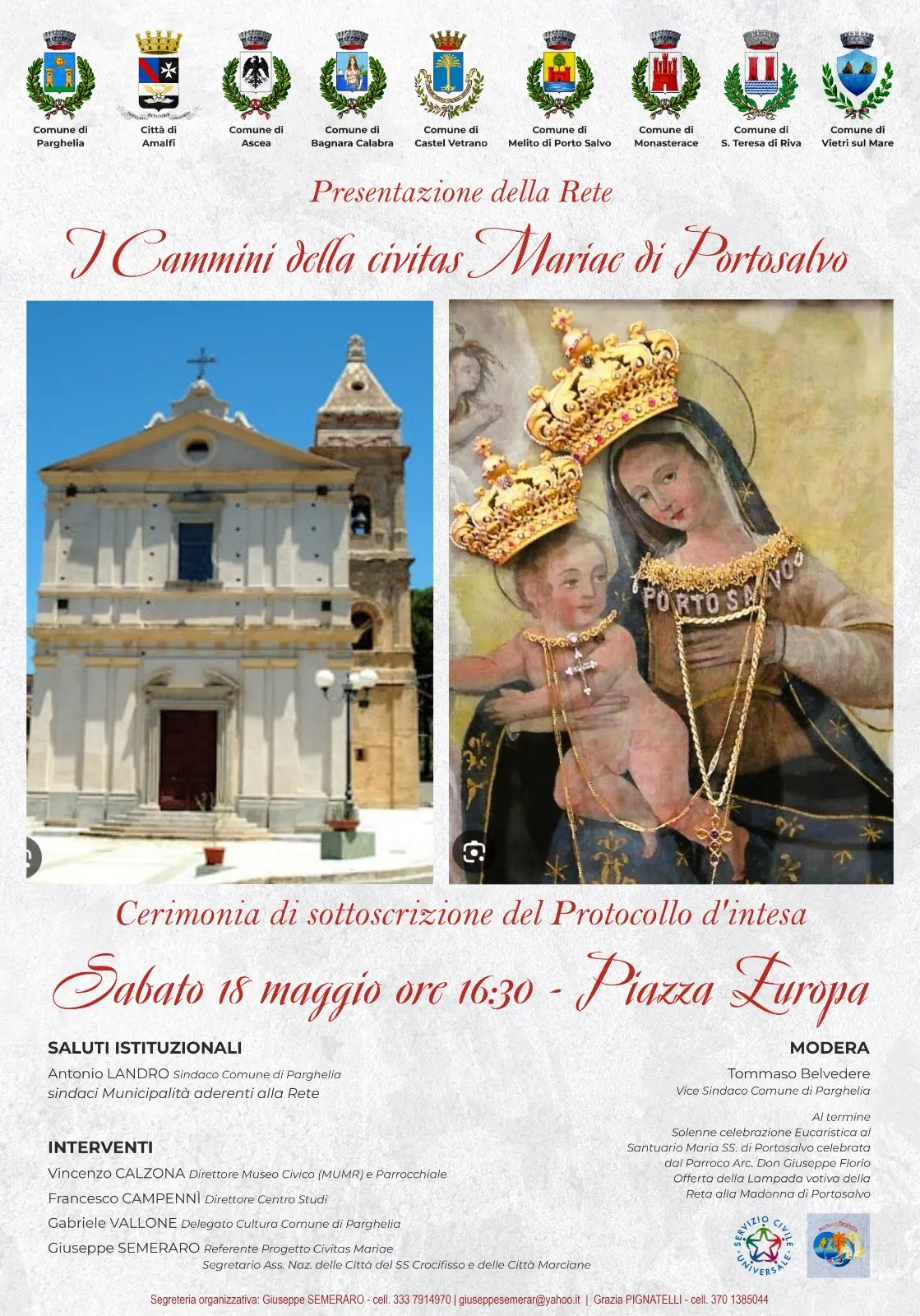 Sabato 18 maggio alle 16.30, in Piazza Europa, Parghelia incontrerà i rappresentanti dei Comuni per la cerimonia di sottoscrizione del protocollo d’intesa e la presentazione del progetto della rete. L’amministrazione comunale guidata dal sindaco Antonio Landro sottolinea: «Con i “Cammini delle Civitas Mariae” si intende avviare un percorso di valorizzazione delle tradizioni culturali e religiose attraverso la promozione delle diverse esperienze e delle diverse peculiarità che caratterizzano ciascun aderente, percorso finalizzato a rafforzare e celebrare le nostre radici, riscoprendo storie e tradizioni che hanno plasmato le nostre comunità».