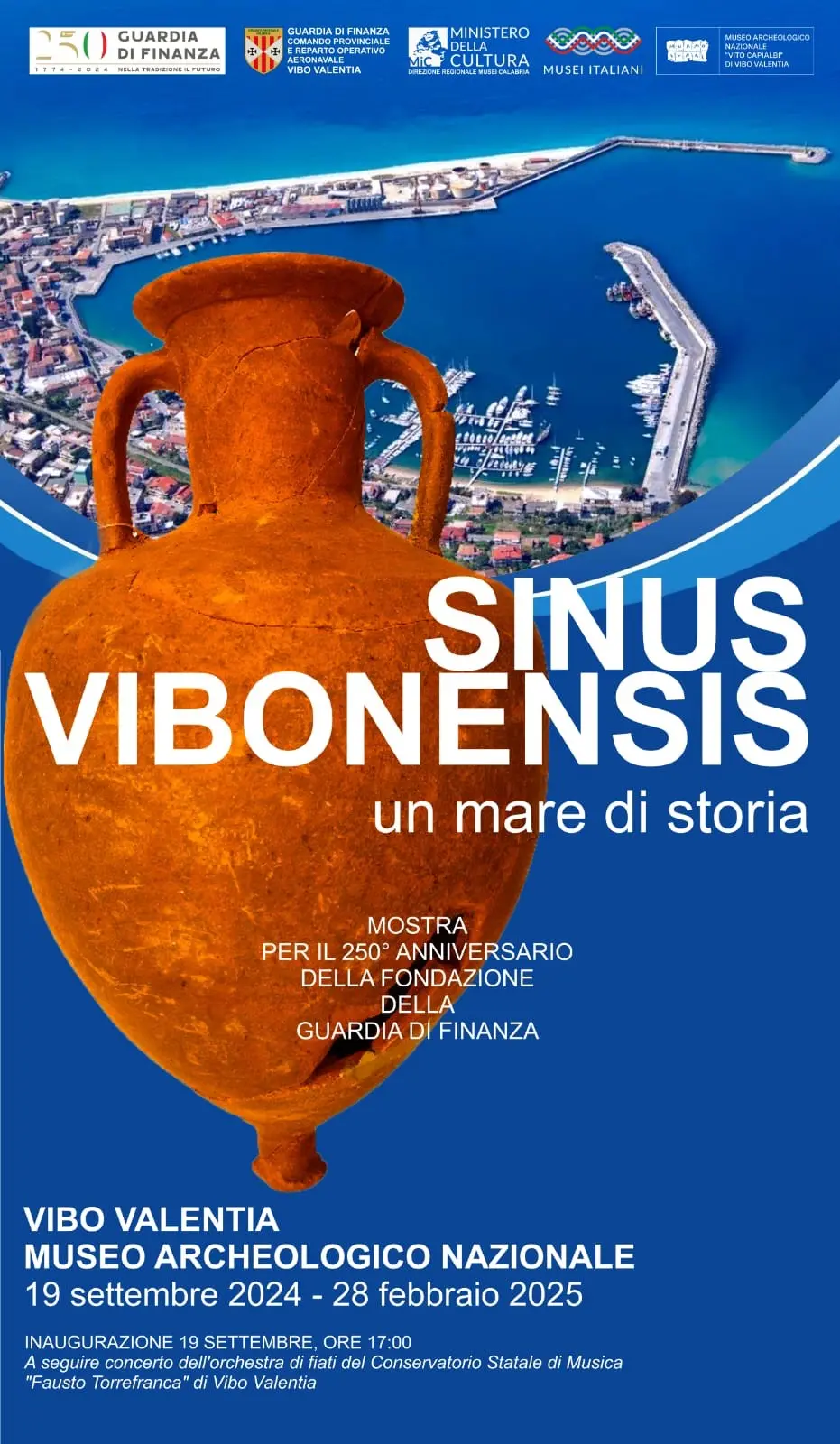 Aprirà oggi 19 settembre la mostra “Sinus Vibonensis, un mare di storia”, organizzata dal Reparto operativo aereonavale del Comando provinciale di Vibo Valentia nell’ambito delle celebrazioni per 250esimo anniversario della fondazione del Corpo della Guardia di Finanza. Teatro della rassegna, il Museo archeologico nazionale “Vito Capialbi” incastonato nel castello normanno-svevo. La cerimonia inaugurale prevede alla 17 l’inizio dell’accesso delle autorità, degli altri invitati e delle scolaresche. Subito dopo ci saranno, la conferenza di celebrazione dell’evento, l’inaugurazione della mostra (con tanto di visita guidata) e il concerto dell’Orchestra di fiati del Conservatorio statale di musica “Fausto Torrefranca” di Vibo Valentia. Il Reparto operativo aereonavale del Comando provinciale della Guardia di Finanza organizza la rassegna con la collaborazione del Comune di Vibo Valentia, del Museo archeologico nazionale, del Conservatorio Torrefranca e dell’Ambito territoriale del Ministero dell’Istruzione e del Merito.