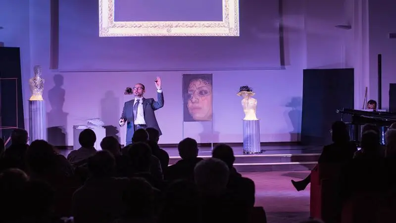 I protagonisti di RI(O)SO, in un’alternanza di recitazione e canto sulle arie di Mozart, Rossini, Donizetti, Verdi, fino Menotti, si sono mossi sul palcoscenico e tra il pubblico seguendo la trama di un racconto accattivante, contestualizzato proprio nel Museo d’Arte Limen, che vede il direttore (interpretato da Daniele Piscopo) impegnato a spiegare le ragioni di una mostra dedicata al RIUSO ad una giovane turista americana, poco interessata alle sue parole quanto, piuttosto, a fare selfie con le opere esposte. Ma tutto cambia con l’arrivo al Museo di un pacco che contiene una bambola (Raffaella Palumbo), un’opera d’arte “iper reale” come viene definita dallo stesso direttore. Seguendo le istruzioni che l’accompagnano la mette in funzione stabilendo con lei un contatto, una relazione: è proprio in questa relazione che l’opera d’arte prende vita e manifesta tutta la potenza del suo linguaggio espressivo.