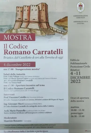 A quest’opera straordinaria, Briatico dedica una mostra dal titolo “Il codice Romano Carratelli, Briatico dal Castellotto di ieri alla Torretta di oggi”. Un progetto in programma dal 4 all’11 dicembre nei locali del Centro polifunzionale della Protezione civile. L’esposizione sarà visitabile dalle 10 alle 12.30, e dalle 16.30 alle 19.00. In occasione dell’inaugurazione, sarà realizzato un focus sul manoscritto. Ai saluti del sindaco Lidio Vallone seguiranno quelli dell’assessore Maria Teresa Centro, dell’avvocato Alessandro Romano Carratelli e della dottoressa Teresa Saeli. Approfondimenti a cura di Vincenzo Cataldo, dottore di ricerca Università di Messina; Giuseppe Macrì, deputazione di Storia patria; l’architetto Mario Panarello, accademia di Belle arti di Bari. In occasione della giornata sarà possibile ammirare il manoscritto originale. L’appuntamento è moderato dal giornalista Maurizio Bonanno.