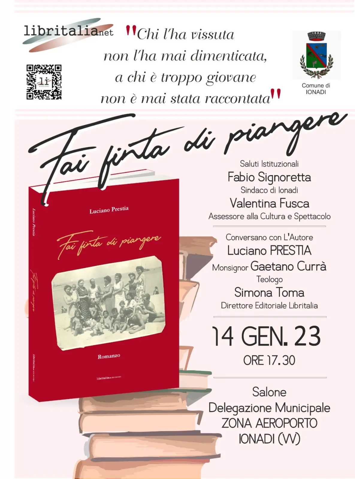 “Fai finta di piangere”. È questo il titolo del libro che sarà presentato sabato 14 gennaio a Vena di Ionadi, presso il palazzo della delegazione municipale situato in località Aeroporto. L’evento letterario – dopo la pausa dedicata agli eventi prettamente natalizi – sancirà la ripresa delle attività culturali e il riavvio degli spazi di discussione organizzati e promossi sul territorio dall’amministrazione comunale di Ionadi guidata dal sindaco Fabio Signoretta. L’incontro di presentazione del romanzo scritto da Luciano Prestia prenderà il via alle 17.30. Il programma della manifestazione, dopo i saluti i istituzionali del primo cittadino e dell’assessore al ramo Valentina Fusca, prevede il colloquio e la discussione in sala tra l’autore, il direttore editoriale di “Libritalia” Simona Toma e monsignor Gaetano Currà, quest’ultimo autorevole teologo e profondo conoscitore del patrimonio materiale e immateriale che contraddistingue la comunità di Ionadi e tutto l’entroterra vibonese. [Continua in basso]