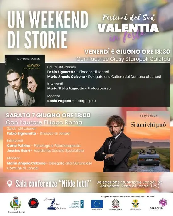 Sarà una due giorni all’insegna della cultura, quella che si appresta a vivere la cittadinanza di Jonadi. In questo fine settimana l’amministrazione comunale e l’associazione “Valentia” proporranno, infatti, altrettanti interessanti eventi letterari. Un weekend di storie” rientra nell’ambito dell’annuale programma “Jonadi Città che legge” e del calendario di eventi “Festival del Sud – Valentia in Festa”.