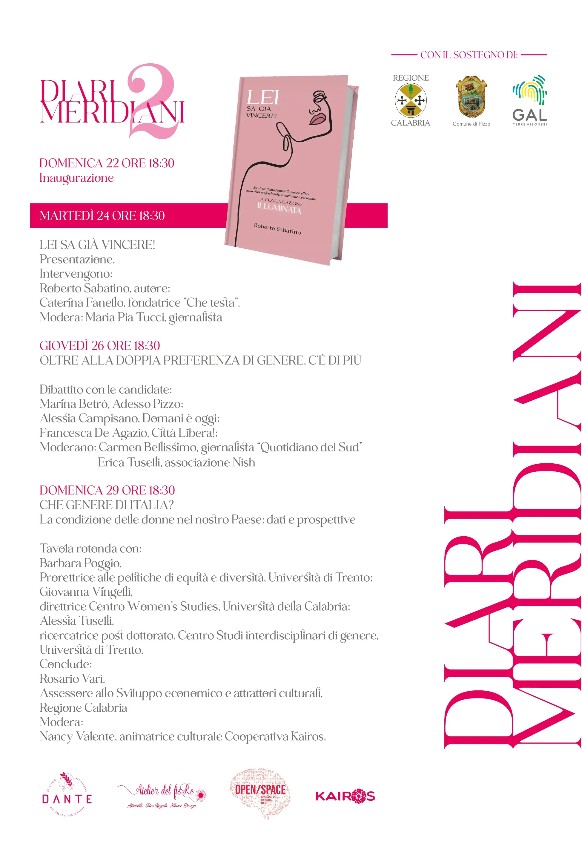Gran finale domenica 29 ore 18:30 con la tavola rotonda dal titolo: “Che GENERE di Italia? La condizione delle donne nel nostro Paese: dati e prospettive”. Interverranno: Barbara Poggio, Prorettrice alle politiche di equità e diversità dell’ Università di Trento; Giovanna Vingelli, direttrice Centro Women’s Studies, Università della Calabria ed Alessia Tuselli, ricercatrice post dottorato del Centro Studi interdisciplinari di genere, Università di Trento. Le conclusioni saranno affidate all’ assessore allo Sviluppo economico e attrattori culturali della Regione Calabria Rosario Varì. A moderare l’incontro Nancy Valente, animatrice culturale Cooperativa Kairos.