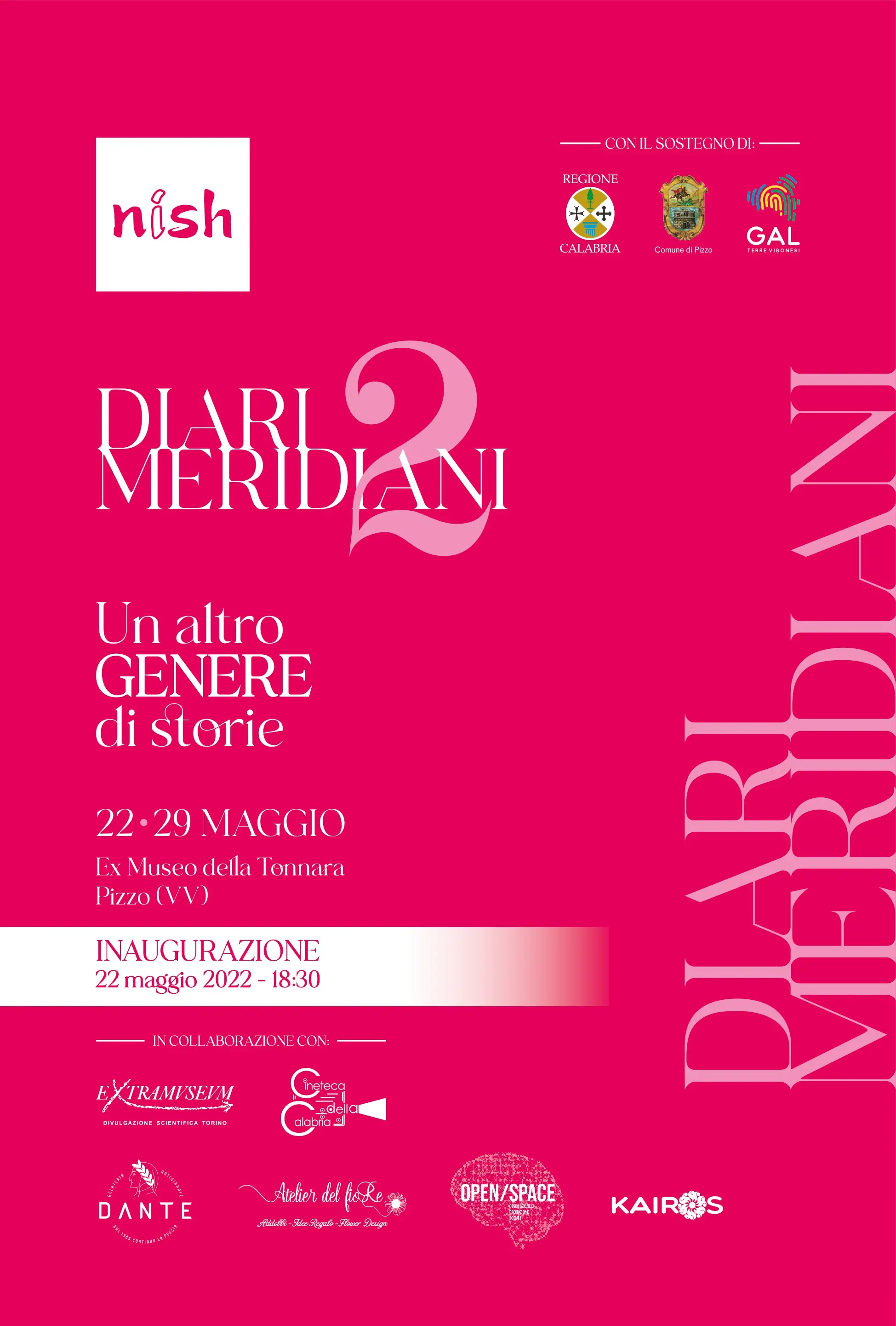 Dopo due anni di stop a causa pandemia, l’associazione Nish torna ad organizzare la kermesse culturale Diari Meridiani. Da domenica 22 a domenica 29 maggio la struttura dell’ex Museo della Tonnara alla Marina di Pizzo, si popolerà di voci, arte, libri e dibattiti. Il progetto è finanziato dalla Regione Calabria con il sostegno del Comune di Pizzo e del Gal Terre Vibonesi, in collaborazione con l’Extramuseum di Torino, la Cineteca della Calabria, l’associazione Open Space e la Cooperativa Kairos.