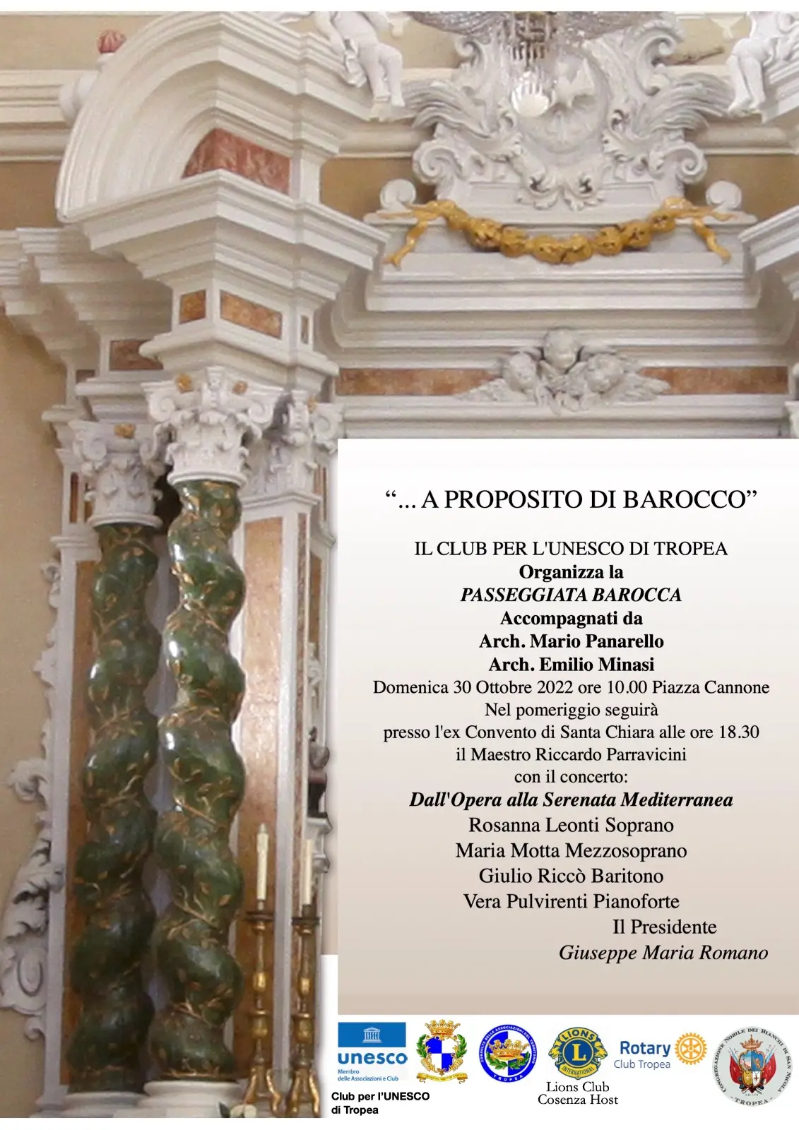 L’appuntamento è promosso dal Club per l’Unesco cittadino in sinergia con Comune e altri sodalizi. Ad illustrare le meraviglie storiche di Tropea, due guide d’eccezione: gli architetti Mario Panarello ed Emilio Minasi. L’inizio è previsto alle ore 10.00, piazza Cannone. Nel pomeriggio, presso l’ex consento Santa Chiara, alle ore 18.00 previsto il concerto “Dall’Opera alla Serenata mediterranea”, appuntamento con la grande musica diretto dal maestro Riccardo Parravicini. Sul palco: Rosanna Leonti, soprano; Mara Motta, mezzosoprano; Giulio Riccò, baritono e Vera Pulvirenti al pianoforte. “A proposito di Barocco” punta ad accendere i riflettori su un periodo di rilievo per Tropea. In passato sono state realizzate iniziative incentrate sulla fase storica vissuta a pieno dalla cittadina costiera. Tra queste, la mostra al Museo diocesano “Del vero e dell’oro” con l’esposizione di opere di Mattia Preti e Luca Giordano nonché tele di Giuseppe Grimaldi, artista locale, su cui il barocco napoletano ebbe forte influenza.