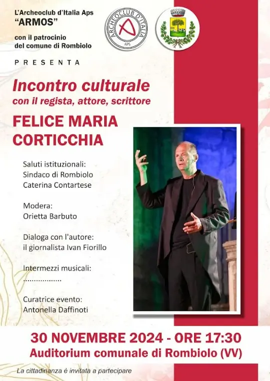 L’evento culturale, a cura di Antonella Daffinoti, è organizzato dall’Archeoclub d’Italia Aps “Armos” e patrocinato dal Comune di Rombiolo. I lavori, moderati da Orietta Barbuto, prenderanno il via con i saluti istituzionali del sindaco Caterina Contartese. A conversare con l’autore, attore e regista sarà il giornalista Ivan Fiorillo.
