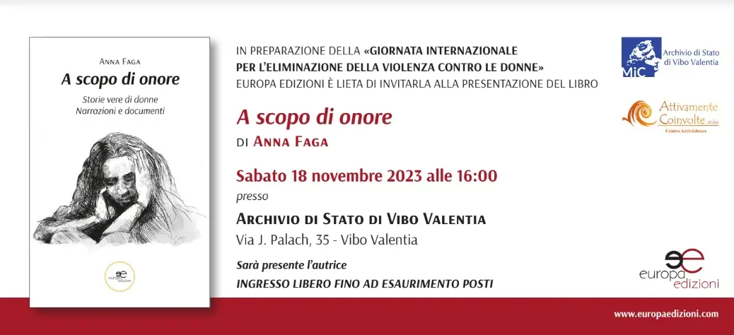 In preparazione della “Giornata internazionale per l’eliminazione della violenza contro le donne” all’Archivio di Stato di Vibo Valentia, il 18 novembre alle ore 16.00, si terrà la presentazione del libro “A scopo di onore” della professoressa Anna Faga. Basato su documenti del Tribunale penale di Vibo Valentia conservati dall’Archivio di Stato, il volume racconta le drammatiche vicende di sei donne della provincia di Vibo che hanno subito diverse forme di violenza, negli anni Quaranta del Novecento. Grazie alla ricerca d’archivio riemergono così storie di donne umiliate e offese, che hanno combattuto lotte impari per cercare di ottenere giustizia e si sono scontrate con i pregiudizi di cui erano imbevuti anche coloro che avrebbero dovuto tutelare i loro diritti: storie lontane nel tempo, ma tristemente vicine. Dopo i saluti introduttivi da parte della direttrice dell’Archivio di Stato di Vibo Valentia, Rosada Pezzo; l’incontro prevede interventi dell’avvocato Stefania Figliuzzi presidente del “Centro Antiviolenza, Attivamente coinvolte”, referente DI. RE. Regione Calabria; Rosario Varì, assessore regionale; Marco Valenti, archivista e Giulia Barrera, soprintendente archivistica e bibliografica della Calabria. Prevista la lettura di alcuni brani del libro, a cura dell’Arci Teatro di Vibo Valentia, con un accompagnamento musicale del flautista Giuseppe Massaria. Sarà presente l’autrice.