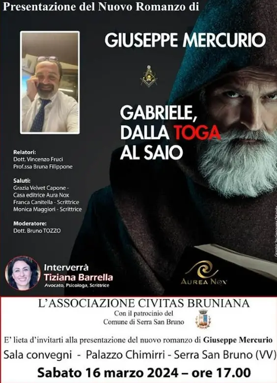 Sabato 16 marzo, a Serra San Bruno, verrà presentato nella cornice di Palazzo Chimirri, “Gabriele dalla Toga al Saio”. Il romanzo di Giuseppe Mercurio, avvocato-scrittore, racconta il percorso di espiazione e redenzione di un penalista che a un certo punto della vita decide di abbandonare la toga per il saio. Nell’opera, il mondo sovra-sensibile si fonde con il quotidiano in un viaggio che come palcoscenico ha uno storico convento calabro. In questo mistico luogo dove storia, antiche conoscenze e scienza si fondono, un frate si occupa di persone apparentemente possedute da entità demoniache e in altri casi affronta vere proprie possessioni diaboliche. L’evento, moderato dal Bruno Tozzo, presidente dell’Associazione “Civitas Bruniana”, organizzatrice dell’evento, vanterà i contributi dei relatori Vincenzo Furci e Bruna Filippone. Interverranno le scrittrici Franca Canitella e Monica Maggiori e l’editrice Grazia Velvet Capone della Casa Editrice Aurea nox. Appuntamento dalle ore 17.00