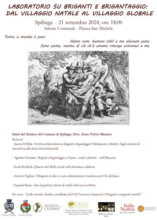 In questa traccia si inserisce il laboratorio sul brigantaggio che si svolgerà sabato prossimo a Spilinga. Oltre al patrocinio del Comune di Spilinga insieme al Comune di Drapia, l’evento vede la collaborazione del Centro di ricerca “Laboratorio di Storia giuridica ed economica” dell’Università Magna Graecia di Catanzaro, la Deputazione di Storia Patria per la Regione Calabria, l’Associazione culturale Zaleuco Messina-Vibo Valentia, la Biblioteca “Galluppi” di Drapia e l’associazione culturale Italia Nostra (sezione di Vibo Valentia).