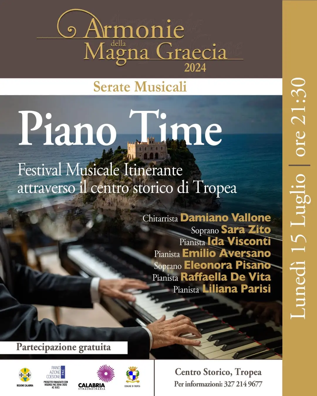 Tropea si prepara ad accogliere l’evento musicale itinerante Piano Time, che si terrà lunedì 15 luglio nel suggestivo centro storico. Questo appuntamento, parte della rassegna Armonie della Magna Graecia giunta alla XXVII edizione, è promosso dal maestro Emilio Aversano in collaborazione con l’amministrazione comunale di Tropea e con la Regione Calabria. La serata inizierà alle 21:30 e si svolgerà nei luoghi più caratteristici del centro storico. Gli artisti si esibiranno in diverse tappe, offrendo al pubblico un’esperienza musicale indimenticabile. Tra i protagonisti ci saranno Sara Zito e Ida Visconti con celebri arie d’opera, Enrico Vallone con musiche chitarristiche, Liliana Parisi con composizioni contemporanee, Eleonora Pisano e Raffaella De Vita con arie da camera e il maestro Emilio Aversano che concluderà la serata con musiche di Chopin.